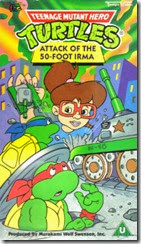 | The Biggest Ever Video Cat No. 96462 Episodes: [51] The Case of the Hot Kimono [47] Blast from the Past To obtain a U certificate cuts of 2 seconds were required. [48] Leatherhead: Terror of the Swamp [50] Usagi Yojimbo [52] Usagi Come Home To obtain a U certificate cuts of 2 seconds were required. [34] The Four Musketurtles [33] Take Me to Your Leader [32] 20,000 Leaks Under the Sea [6] Return of the Shredder To obtain a U certificate cuts of 13 seconds were required. Notes: Includes five previously unreleased episodes followed by the complete contents of the Very Best of the Turtles tape (so a third release for 20,000 Leaks Under the Sea) but with the episode order reversed. |